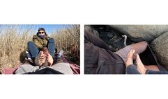 Spy as i jerk his dick with my toes in the bushes, huge ropes of cum! Public footjob, milf feet on bbc, spying cuck's pov